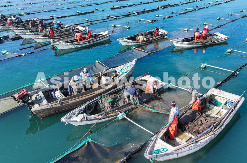 图片说明:2025年3月20日,山东省荣成市天海湾海洋牧场海参养殖区,渔民们在进行海参苗管护作业。