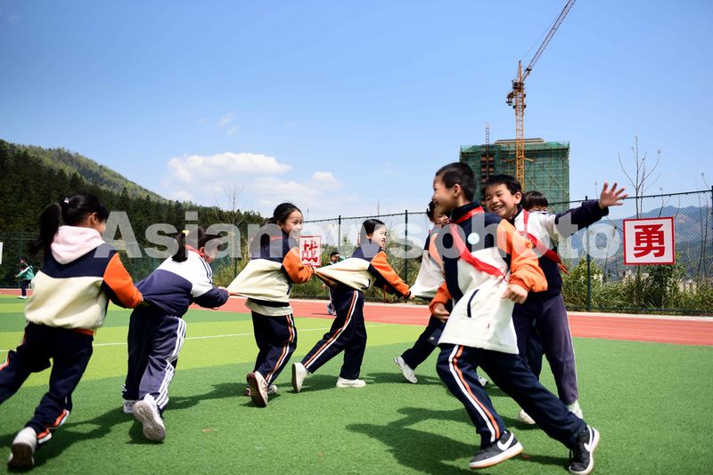 图片说明:2025年3月20日,学生在贵州省黔东南苗族侗族自治州从江县城关第三小学球场上玩“老鹰捉小鸡”游戏。