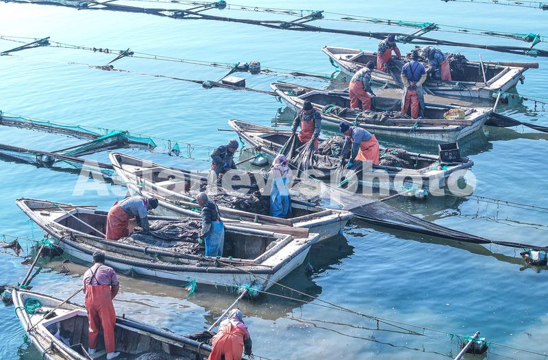 图片说明:2025年3月20日,山东省荣成市天海湾海洋牧场海参养殖区,渔民们在进行海参苗管护作业。