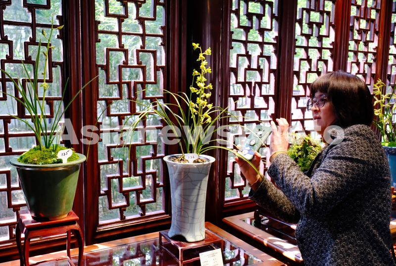 图片说明:2025年3月19日,游人在江苏省苏州市古典园林沧浪亭举办的2025年中国历史名园(苏州)兰花艺术邀请展拍摄兰花作品。
