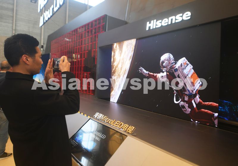 图片说明:2025年3月20日,观众在2025中国家电及消费电子博览会(2025AWE)上观看海信的可拼接MicroLED电视。