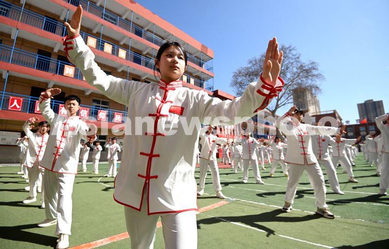 图片说明:3月20日,河北省邯郸市邯山区实验中学的学生在练习太极拳。