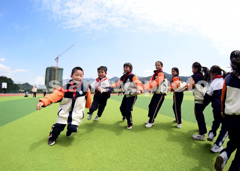 图片说明:2025年3月20日,学生在贵州省黔东南苗族侗族自治州从江县城关第三小学球场上玩“老鹰捉小鸡”游戏。