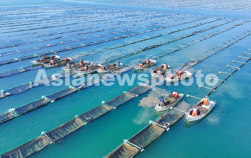 图片说明:2025年3月20日,山东省荣成市天海湾海洋牧场海参养殖区,渔民们在进行海参苗管护作业。