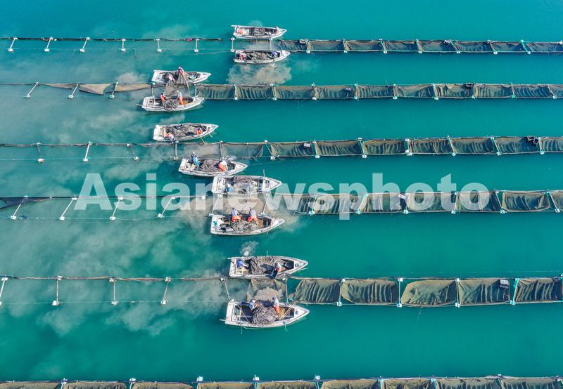 图片说明:2025年3月20日,山东省荣成市天海湾海洋牧场海参养殖区,渔民们在进行海参苗管护作业。