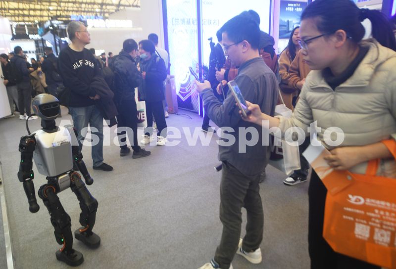 图片说明:2025年3月20日,观众在2025中国家电及消费电子博览会(2025AWE)上观看一款人形机器人。