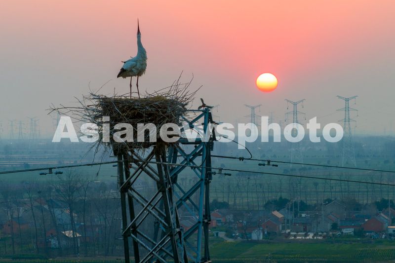 2025年3月19日,东方白鹳在江苏省扬州市宝应县曹甸镇的一处铁塔上筑巢繁育后代。