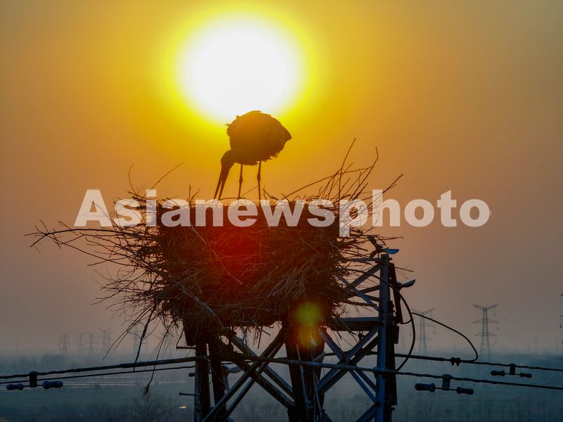 2025年3月19日,东方白鹳在江苏省扬州市宝应县曹甸镇的一处铁塔上筑巢繁育后代。