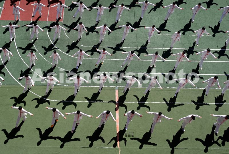 图片说明:3月20日,河北省邯郸市邯山区实验中学的学生在练习太极拳。