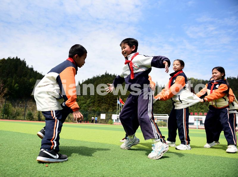 图片说明:2025年3月20日,学生在贵州省黔东南苗族侗族自治州从江县城关第三小学球场上玩“老鹰捉小鸡”游戏。