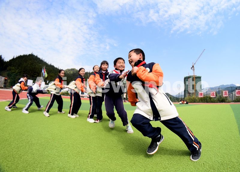 图片说明:2025年3月20日,学生在贵州省黔东南苗族侗族自治州从江县城关第三小学球场上玩“老鹰捉小鸡”游戏。