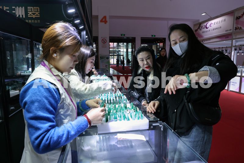 图片说明:2025年3月19日,观众在 2025北京国际珠宝展上选购非洲翠。