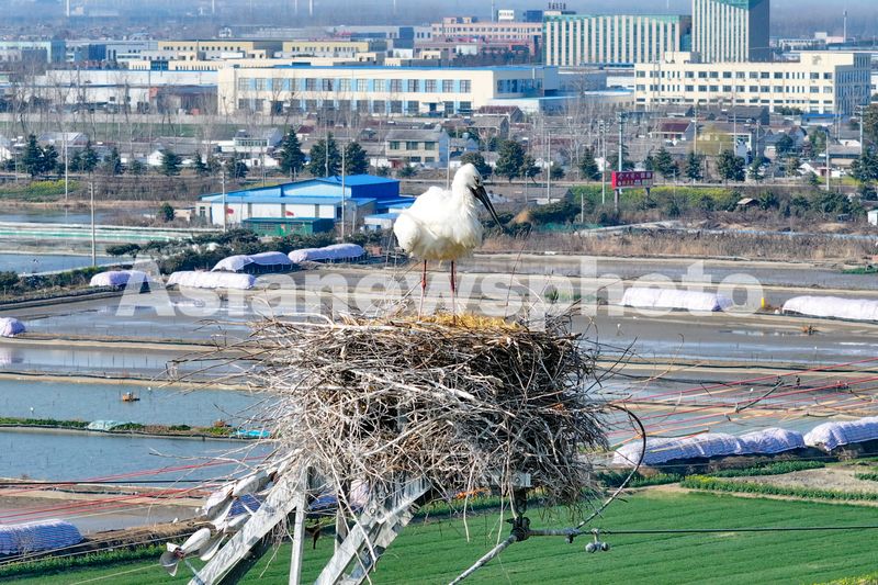 2025年3月19日,在江苏省扬州市宝应县曹甸镇的一处铁塔顶端,东方白鹳在鸟巢中繁育后代。近年来,随着当地生态环境持续向好,这种国家一级保护动物已连续多年在此筑巢繁衍,预计本月将迎来集中孵化期。