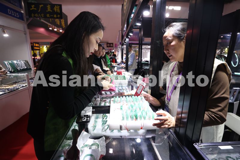 图片说明:2025年3月19日,观众在 2025北京国际珠宝展上选购非洲翠。