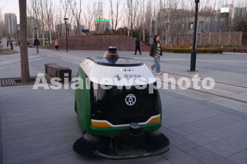 图片说明:2025年3月19日,北京市海淀区京张铁路遗址公园内,一辆无人驾驶环卫车正在进行清扫作业。