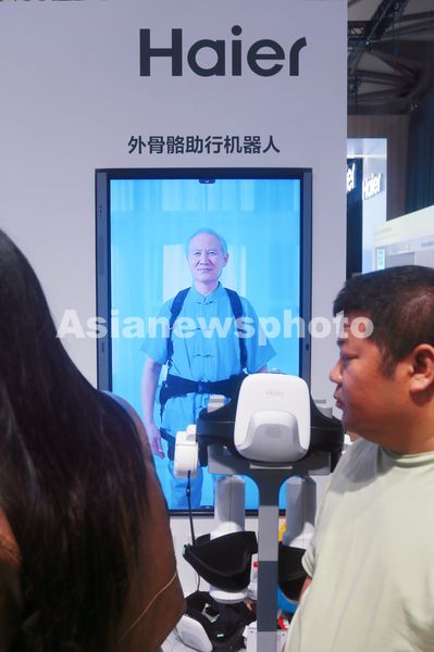 图片说明:2025年3月20日,上海,2025中国家电及消费电子博览上,海尔智家推出用于养老和医疗服务的外骨骼助行机器人。