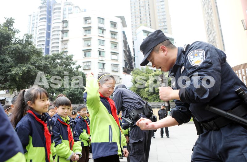 图片说明:2025年3月20日,永川区萱花小学校园,司法警察指导学生们如何有效保护自身安全。