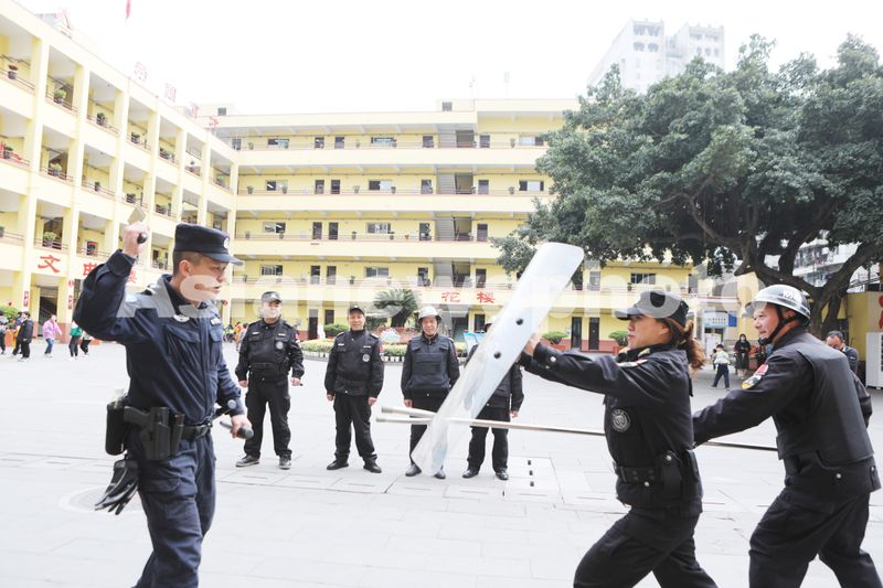 图片说明:2025年3月20日,永川区萱花小学校园,司法警察指导安保人员利用器械的正确使用方法。