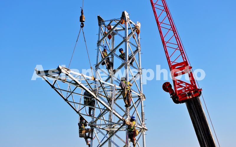 3月20日,在安徽省亳州市涡阳县新兴镇耿皇-焦楼220千伏线路工程G26吊车分段,施工人员在组立铁塔(无人机照片)。