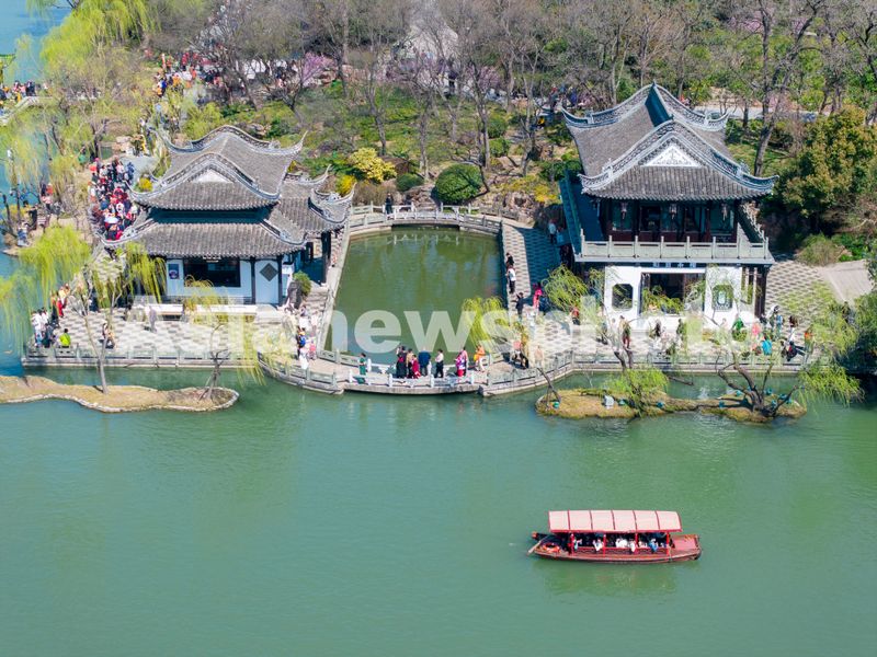 2025年3月21日,江苏扬州瘦西湖风景区春意盎然,红梅绽放,柳枝吐绿,吸引众多游客前来踏青赏花,尽享美好春光。