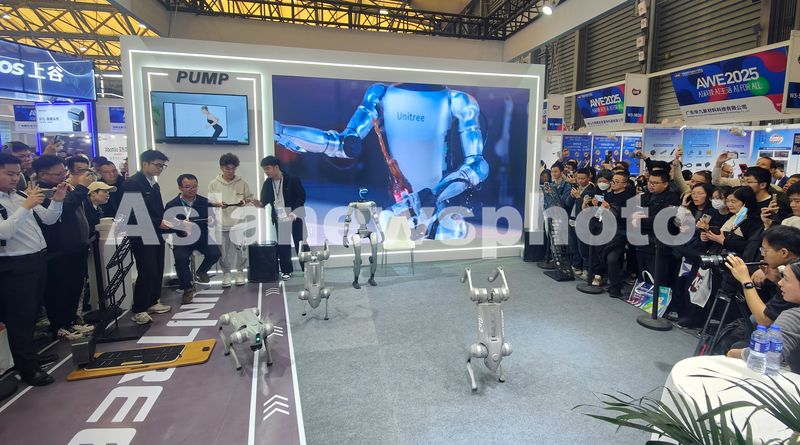图片说明:2025年3月20日,上海,2025中国家电及消费电子博览上,“春晚顶流“宇树科技G1机器人和Go2机器狗一同亮相为观众表演绝活。