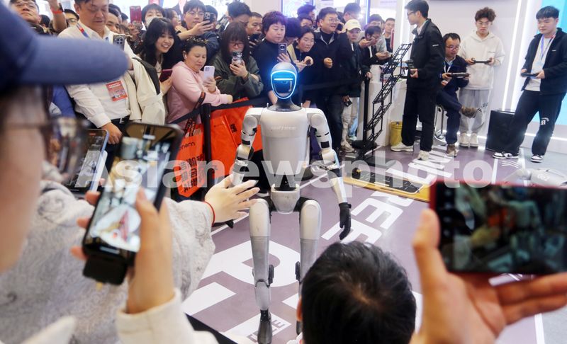 图片说明:2025年3月20日,上海,2025中国家电及消费电子博览上,“春晚顶流“宇树科技G1机器人受到观众热烈追捧,高科技明星的“握手会”人气十足。