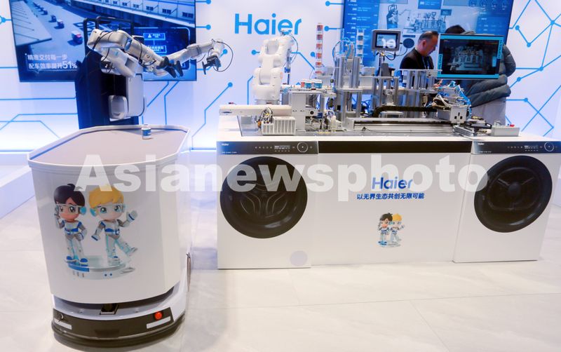 图片说明:2025年3月20日,上海,2025中国家电及消费电子博览上,海尔展示了可移动智能机器人(机械臂)在家电制造生产线上的应用。
