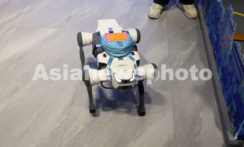 图片说明:2025年3月20日,上海,2025中国家电及消费电子博览上,海尔智家推出用于家庭陪伴的四足智能机器人(机器狗)。