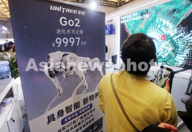 图片说明:2025年3月20日,上海,2025中国家电及消费电子博览上,宇树科技为Go2四足机器人(机器狗)打出“具身智能新物种”的明码标价广告吸引消费者。