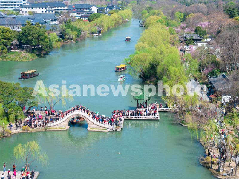 2025年3月21日,江苏扬州瘦西湖风景区春意盎然,红梅绽放,柳枝吐绿,吸引众多游客前来踏青赏花,尽享美好春光。