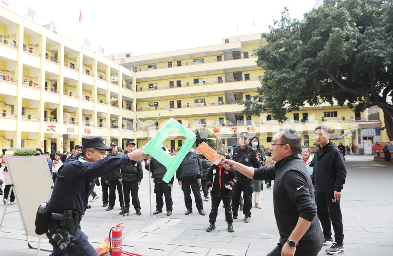 图片说明:2025年3月20日,永川区萱花小学校园,司法警察指导老师学习就便器材的使用和最小作战单元的运用。