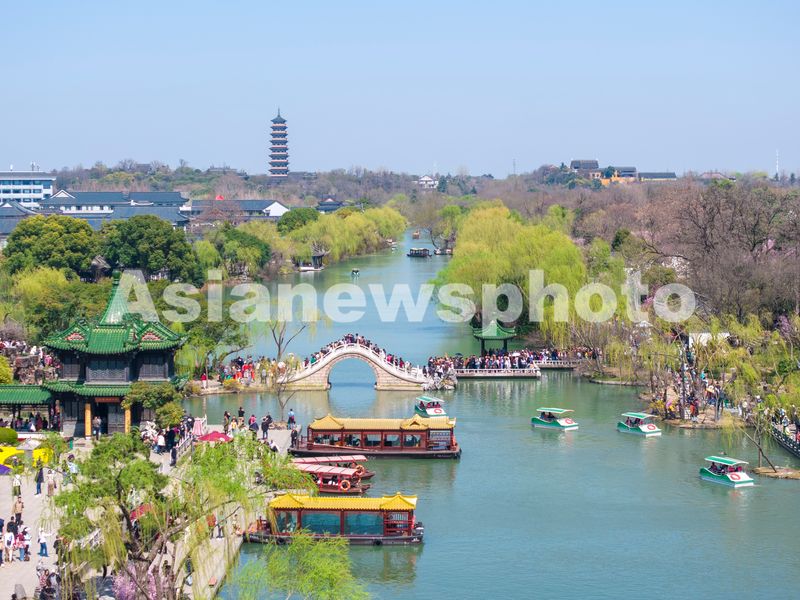 2025年3月21日,游客在江苏扬州瘦西湖风景区赏景游玩。
