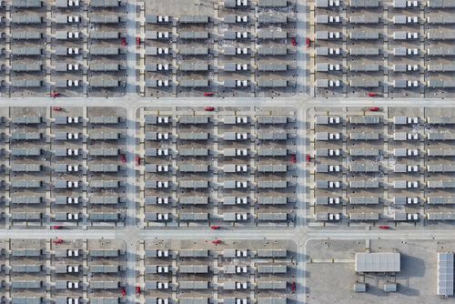 图片说明:2025年3月22日,俯瞰位于宁夏中卫腾格里沙漠南缘的龙源孟家湾295MW/590MWh共享型储能电站,一个个“巨型充电宝”发挥着电网调节作用。