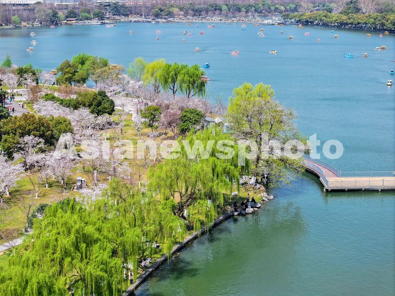 2025年3月22日,江苏南京玄武湖公园春意盎然,樱花绽放,柳枝吐绿,吸引众多游客前来踏青赏花,尽享美好春光。