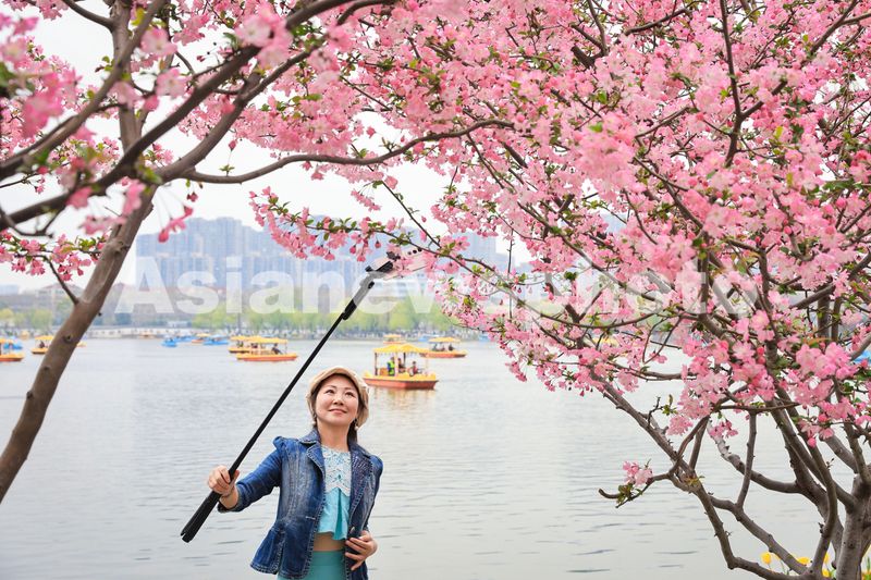 3月23日,游客在南京莫愁湖公园赏花拍照。