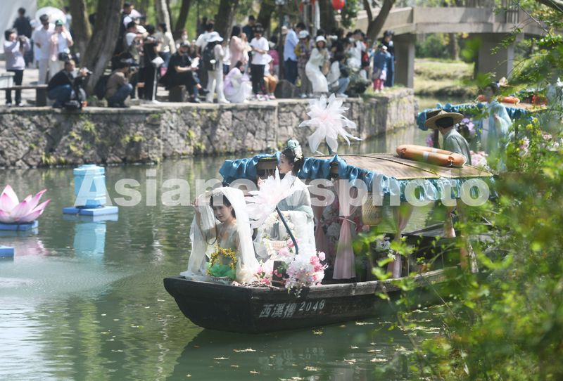 2025年3月24日,由汉服爱好者扮演的“十二花神”乘座“摇橹花船”泛舟杭州西溪湿地与市民游客共庆“花朝节”。
