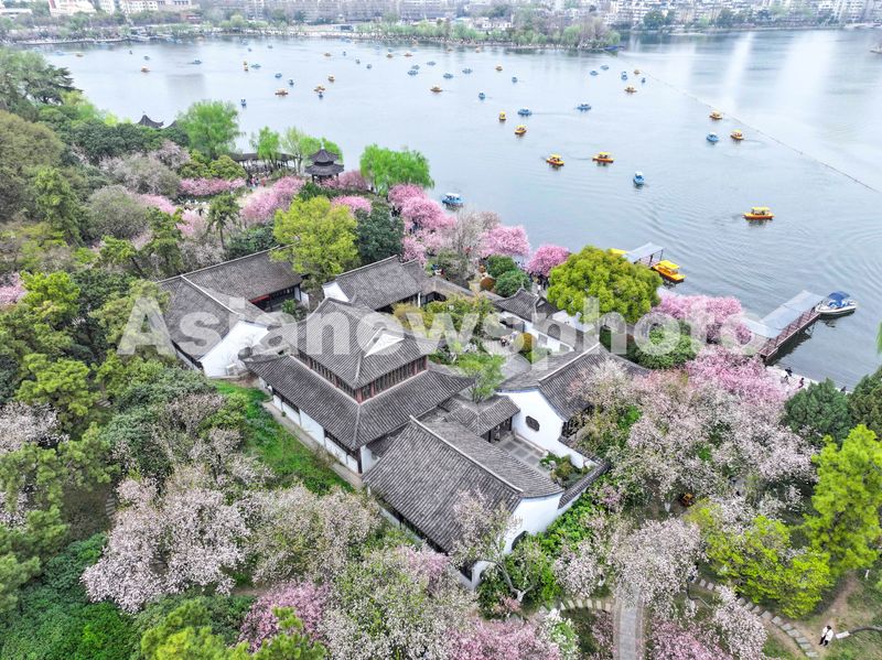 图片说明:2025年3月23日,游客在江苏南京莫愁湖公园赏花游玩。