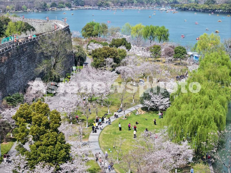 2025年3月22日,江苏南京玄武湖公园春意盎然,樱花绽放,柳枝吐绿,吸引众多游客前来踏青赏花,尽享美好春光。