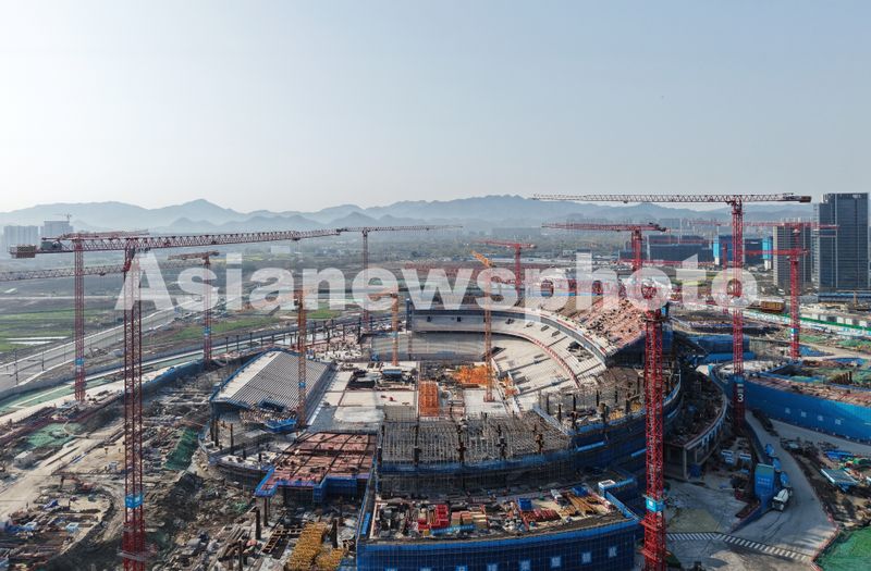 图片说明:2025年3月22日,杭州余杭国际体育中心专业足球场建设现场塔吊林立, 一片繁忙施工景象。