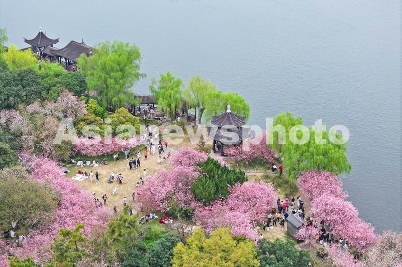 图片说明:2025年3月23日,游客在江苏南京莫愁湖公园赏花游玩。