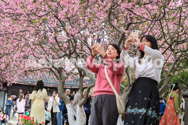 2025年3月23日,南京莫愁湖公园内海棠花盛开,春意盎然,吸引许多游客前来踏青赏花,乐享春光。