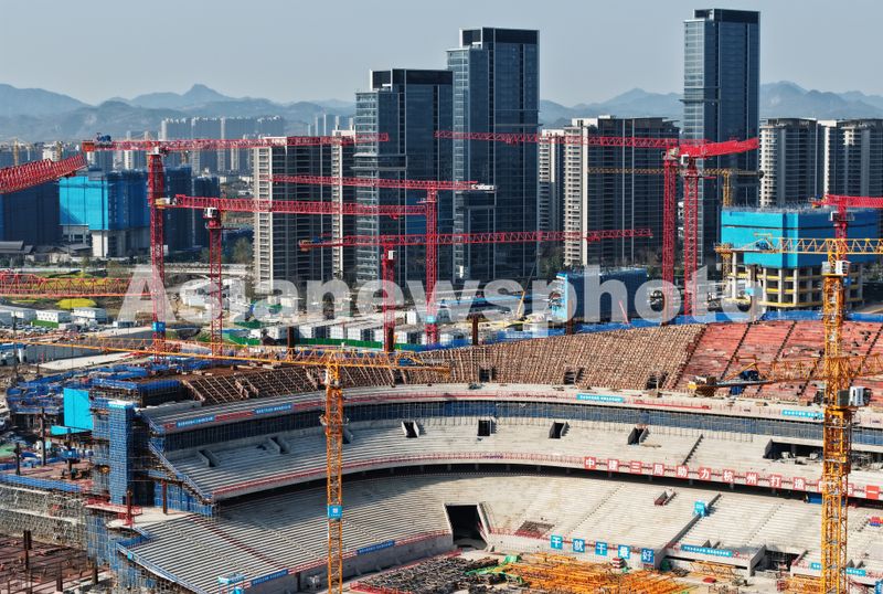 图片说明:2025年3月22日,杭州余杭国际体育中心专业足球场建设现场塔吊林立, 一片繁忙施工景象。