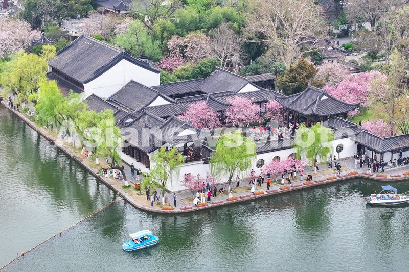 图片说明:2025年3月23日,游客在江苏南京莫愁湖公园赏花游玩。