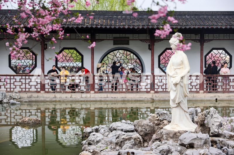 图片说明:2025年3月23日,游客在江苏南京莫愁湖公园赏花游玩。