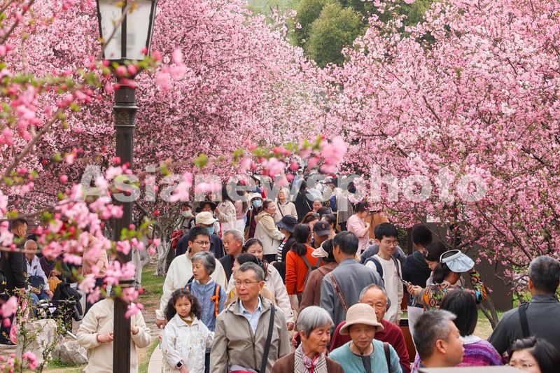 图片说明:2025年3月23日,游客在江苏南京莫愁湖公园赏花游玩。