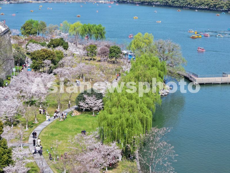 2025年3月22日,江苏南京玄武湖公园春意盎然,樱花绽放,柳枝吐绿,吸引众多游客前来踏青赏花,尽享美好春光。