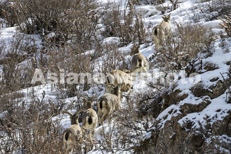 图片说明:2025年3月22日,一群岩羊在祁连山国家公园山丹马场管护区林间。