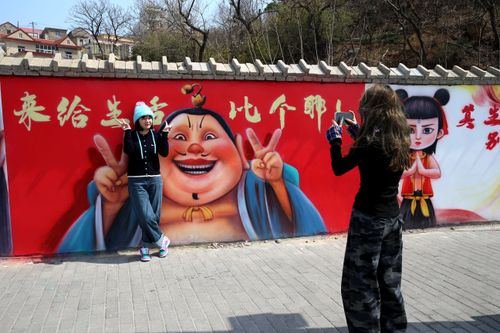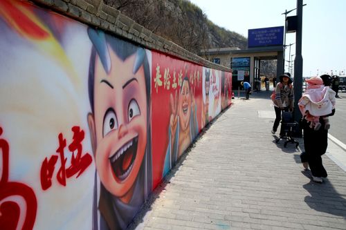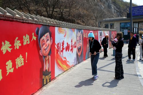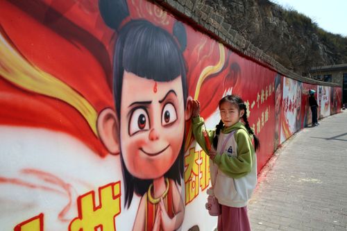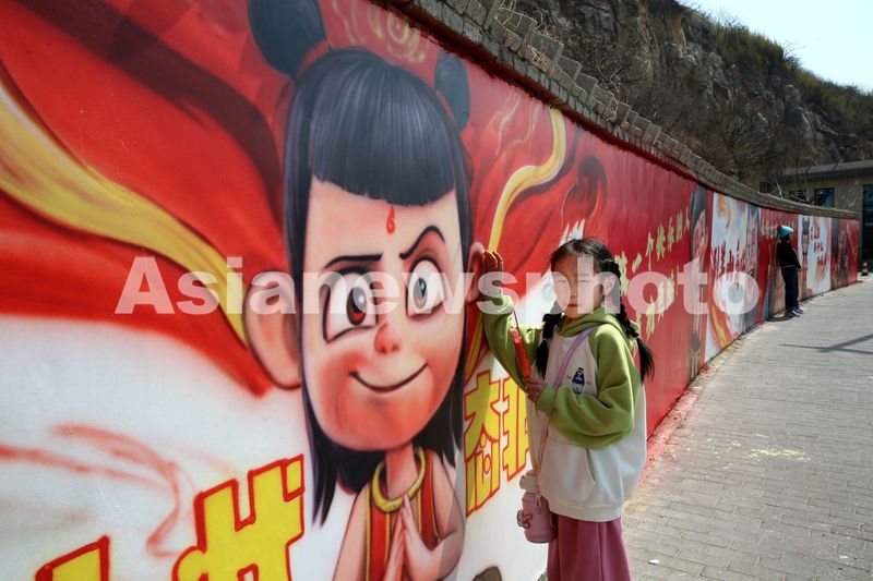 2025年3月23日,小朋友在江苏省连云港市连云区高公岛街道的羊山岛《哪吒之魔童闹海》主题墙绘作品前拍照打卡。