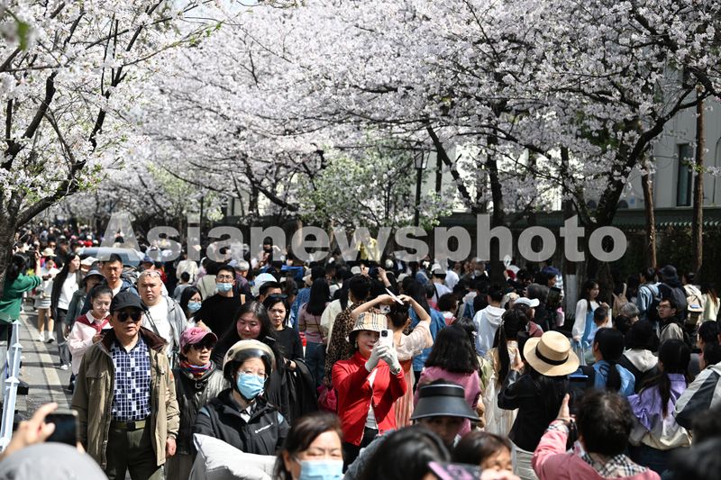 图片说明:2025年3月24日,江苏南京,鸡鸣寺路的樱花进入最佳观赏期,赏花游客人头攒动。