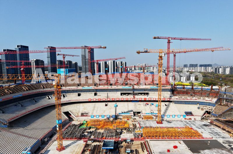 图片说明:2025年3月22日,杭州余杭国际体育中心专业足球场建设现场塔吊林立, 一片繁忙施工景象。
